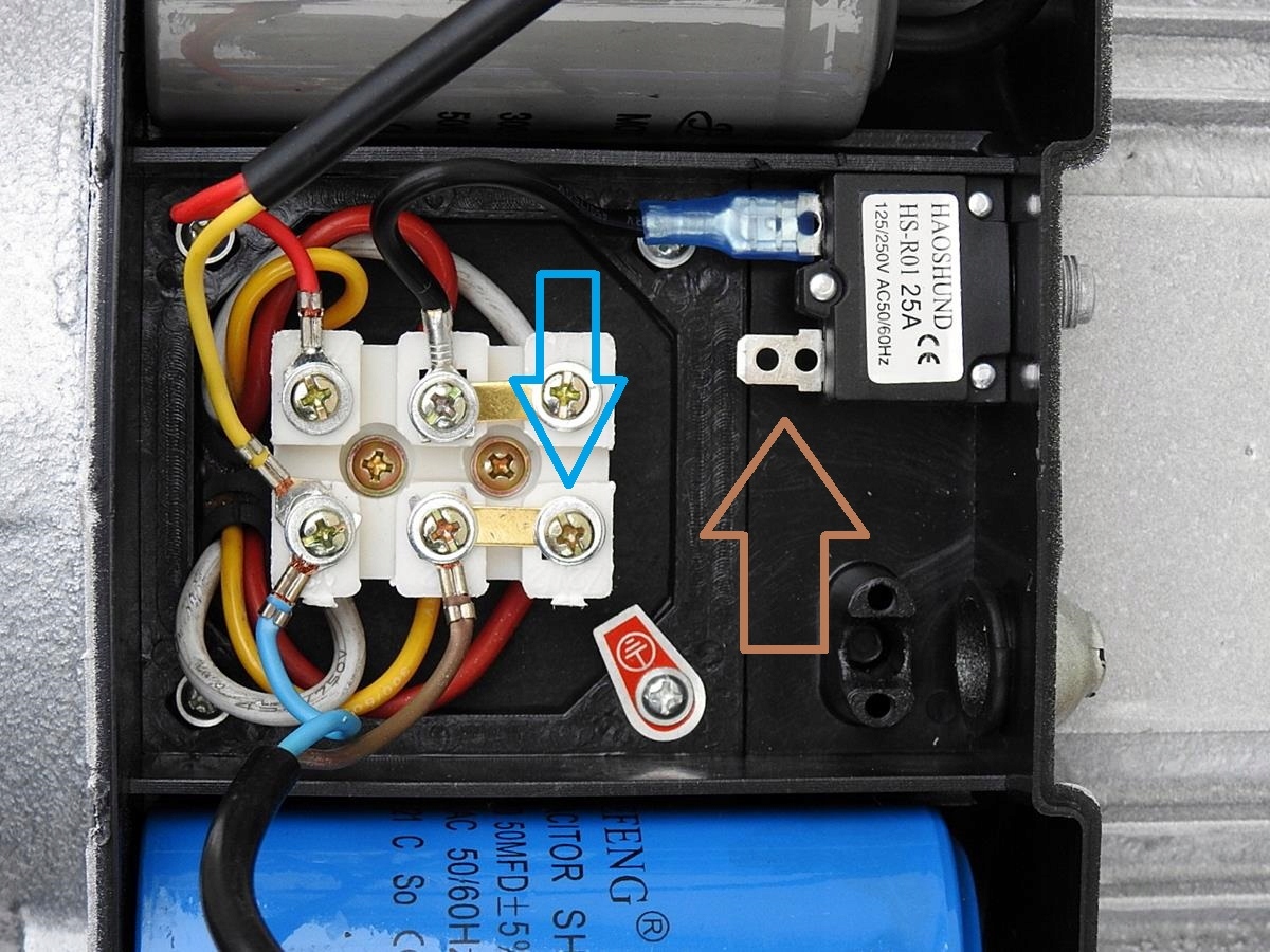 - kabel ochronny podłączamy do korpusu silnika w miejsce czerwonej blaszki informującej o uziemieniu
